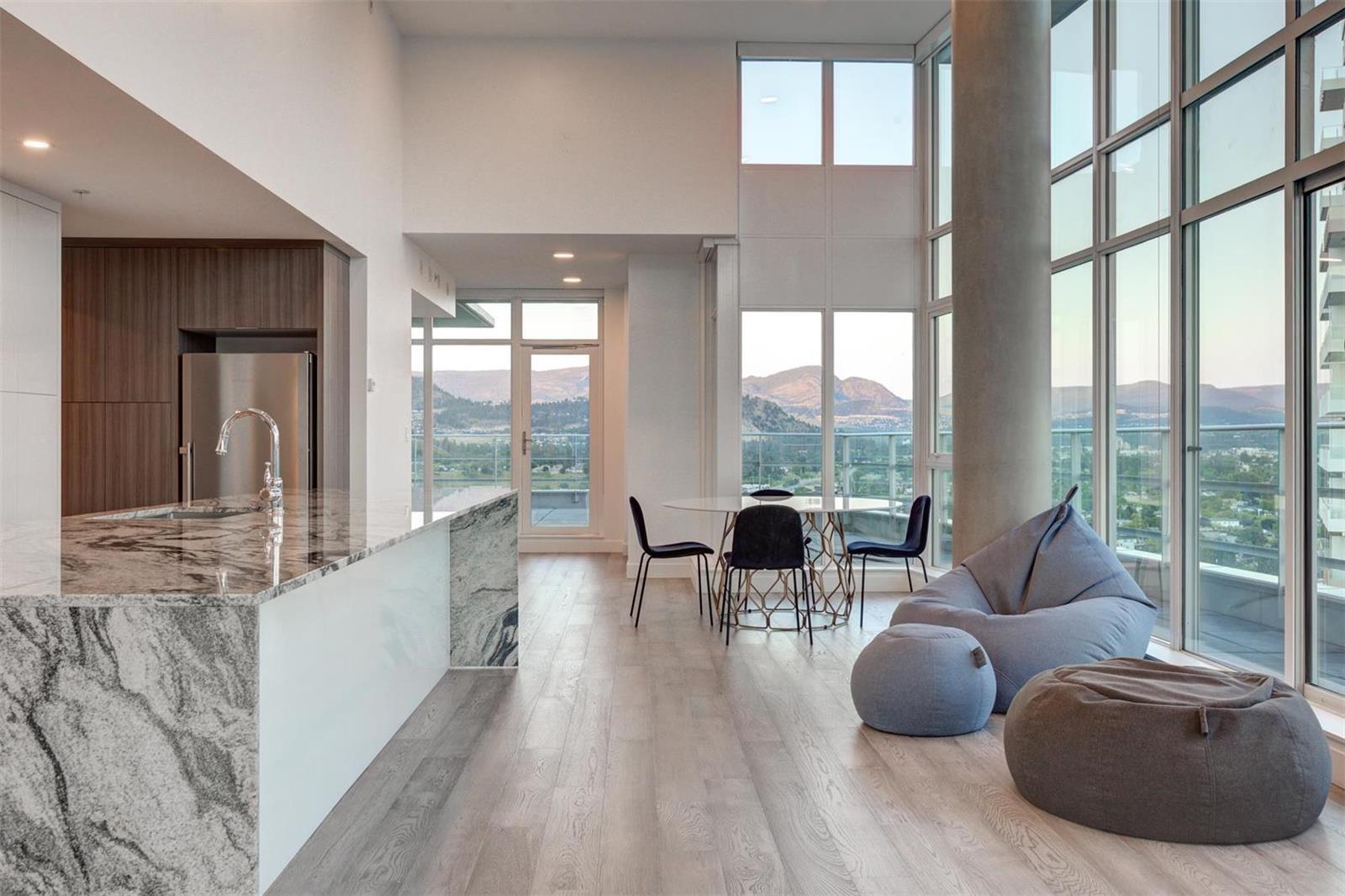 | description: | Penthouse | 1151 SUNSET DRIVE | A truly unique opportunity to live atop one of downtown Kelownas newer towers. With 3 patios totalling over 1600 Sqft of outdoor living space and a staggering 4400 Sqft of indoor living, this sprawling home offers one of the most staggering beautiful views of Okanagan Lake, Kelowna from Knox Mountain to Lower Mission and West Kelowna. With the best advantage to take in sunsets, the 360° views from the floor to ceiling windows will satisfy the most discerning. A total of 4 bedrooms, with two having direct access to the patio and three having an ensuite, the layout provides ample space for guests, office or a studio. With a 138 length island, entertaining from indoors to outdoors, space is accommodating. The great room boasts a fireplace and 180° westerly views while the spacious kitchen, flex and dining space maximize SW views of downtown and Kelowna Yacht Club. 1151 Sunset Drive is pet friendly and features a gym, plunge pool, lounge with games area and kitchen, reflection pool, car wash bay, and secure underground parking. 2 parking stalls and a storage locker are included. The elevator has secure fob entry directly into the home. No short term rentals allowed. |